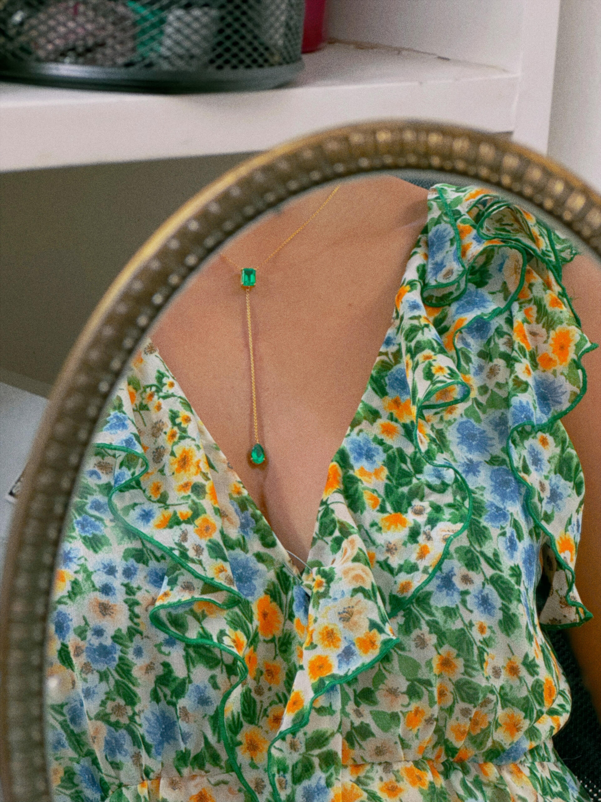 Can be worn two ways - the lower chain attached to the pear shape emerald can be removed